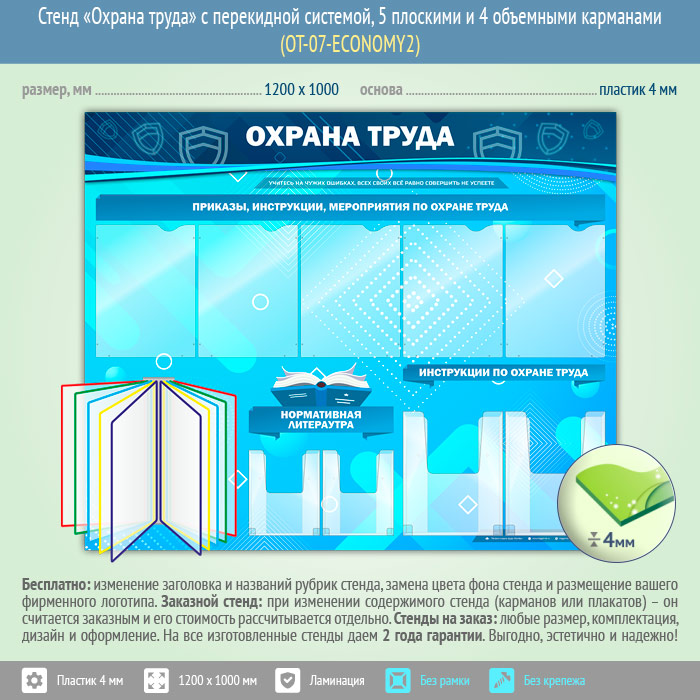 Стенд «Охрана труда» с перекидной системой, 5 плоскими и 4 объемными карманами (OT-07-ECONOMY2) в Бердске купить
