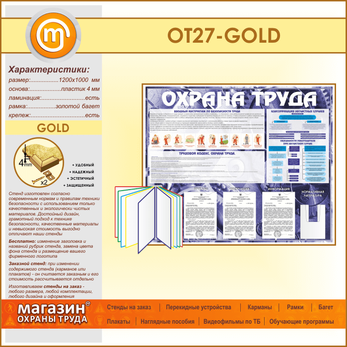 Стенд «Охрана труда» с перекидной системой, 3 плоскими и 1 объемным карманом (OT-27-GOLD) в Бердске купить