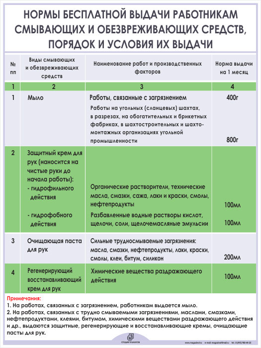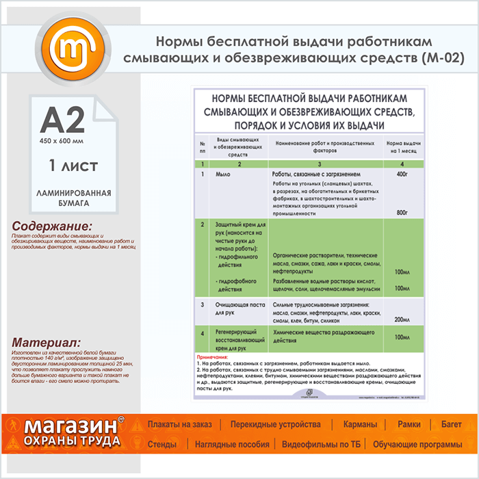 Плакат «Нормы бесплатной выдачи работникам смывающих и обезвреживающих средств» (М-02, ламинированная бумага, А2, 1 лист) в Бердске купить