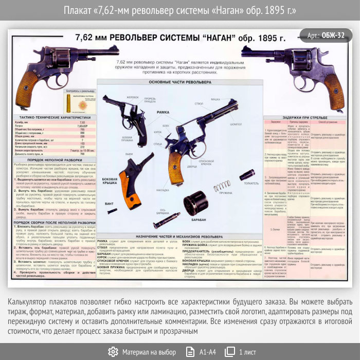 Плакат «7,62-мм револьвер системы «Наган» обр. 1895 г.» (ОБЖ-32, 1 лист) в Бердске купить
