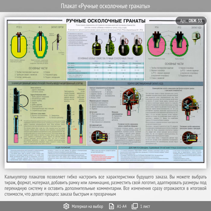 Плакат «Ручные осколочные гранаты» (ОБЖ-33, 1 лист) в Бердске купить