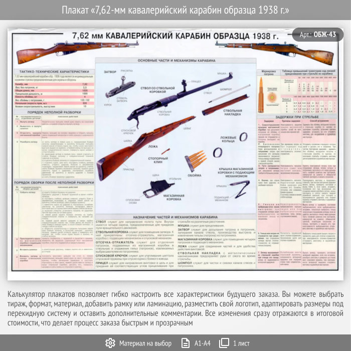Плакат «7,62-мм кавалерийский карабин образца 1938 г.» (ОБЖ-43, 1 лист) в Бердске купить