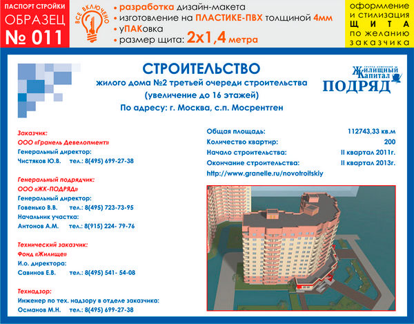 Паспорт стройки, образец № 11 (пластик 4 мм, 2000х1400 cм) в Бердске купить