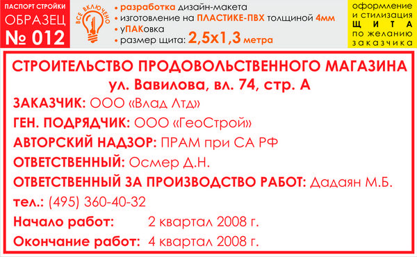 Паспорт стройки, образец № 12 (пластик 4 мм, 2500х1300 cм) в Бердске купить