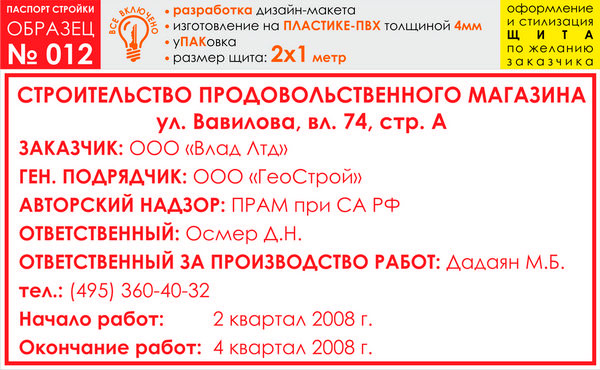 Паспорт стройки, образец № 12 (пластик 4 мм, 2000х1000 cм) в Бердске купить