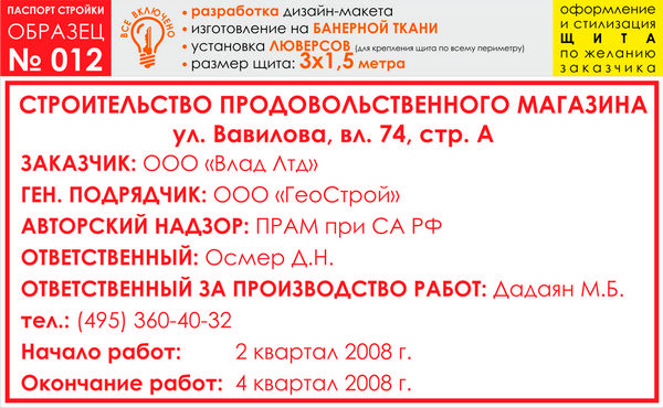 Паспорт стройки, образец № 12 (баннерная ткань, 3000х1500 cм) в Бердске купить