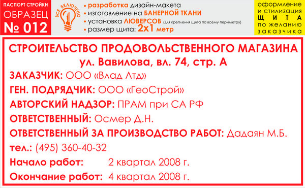 Паспорт стройки, образец № 12 (баннерная ткань, 2000х1000 cм) в Бердске купить