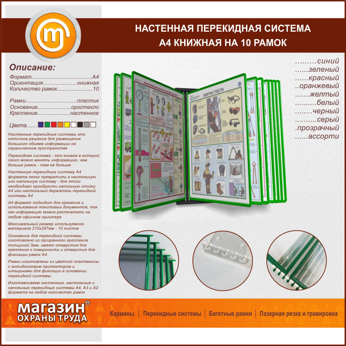 | Настенная перекидная система А4 на 10 рамок книжная (усиленная) | Настенная перекидная система А4 на 10 рамок книжная (усиленная) |