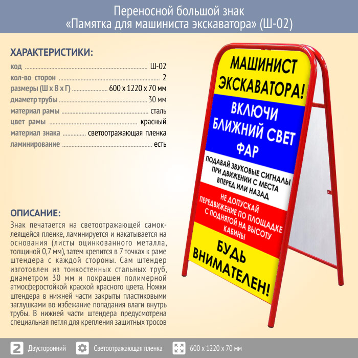 Переносной большой знак «Памятка для машиниста экскаватора» (Ш-02, двусторонний, светоотражающая пленка) в Бердске купить