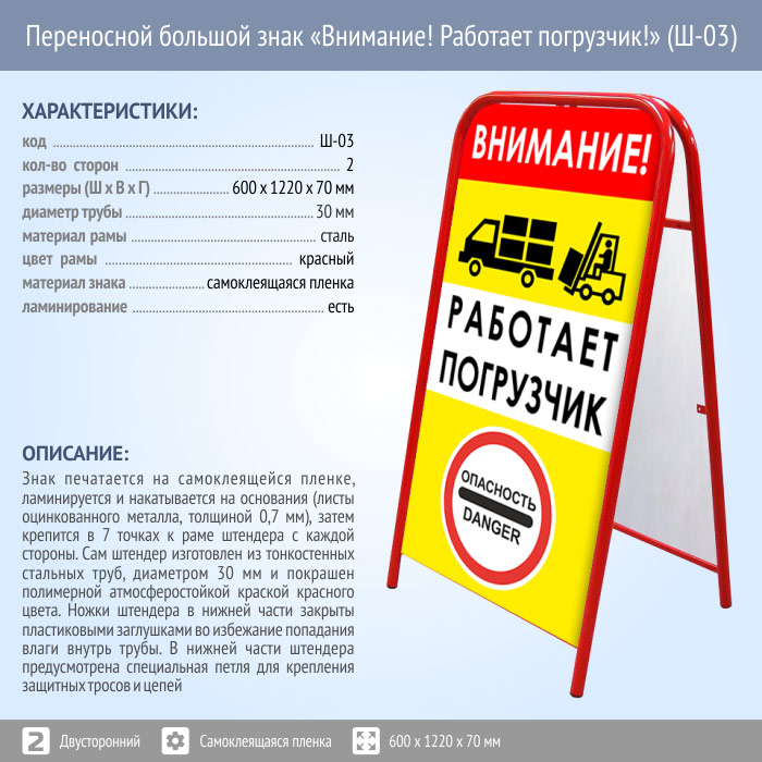 Переносной большой знак «Внимание! Работает погрузчик!» (Ш-03, двусторонний, самоклеящаяся пленка) в Бердске купить