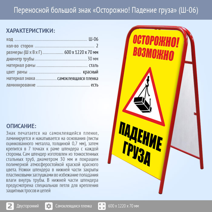 Переносной большой знак «Осторожно! Падение груза» (Ш-06, двусторонний, самоклеящаяся пленка) в Бердске купить
