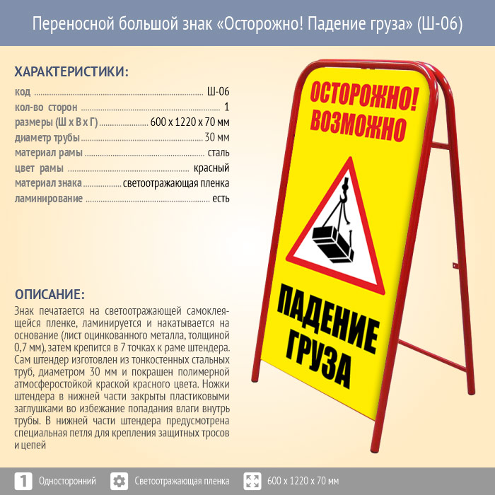 Переносной большой знак «Осторожно! Падение груза» (Ш-06, односторонний, светоотражающая пленка) в Бердске купить