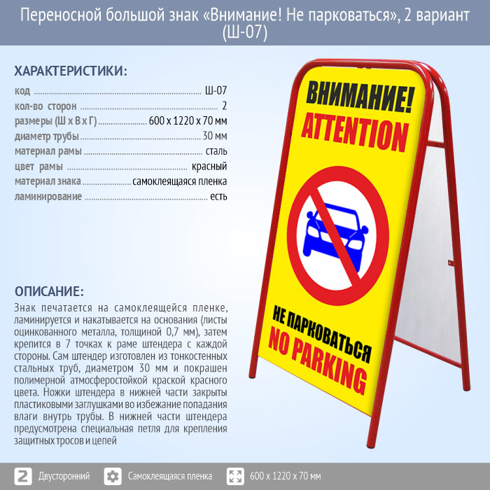 Переносной большой знак «Внимание! Не парковаться», 2 вариант (Ш-07, двусторонний, самоклеящаяся пленка) в Бердске купить