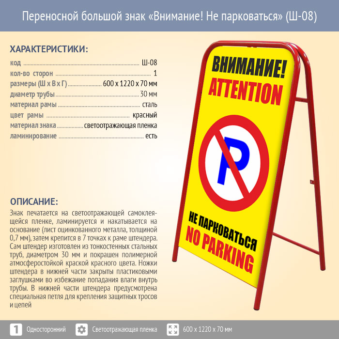 Переносной большой знак «Внимание! Не парковаться» (Ш-08, односторонний, светоотражающая пленка) в Бердске купить