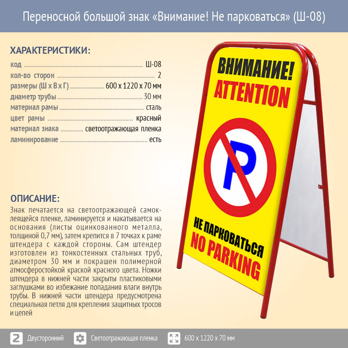 Переносной большой знак «Внимание! Не парковаться» (Ш-08, двусторонний, светоотражающая пленка) в Бердске купить