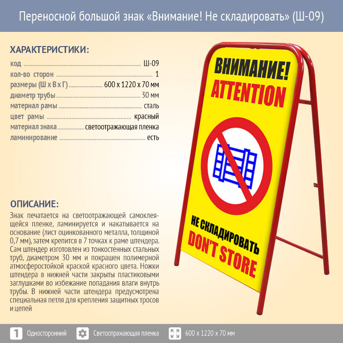 Переносной большой знак «Внимание! Не складировать» (Ш-09, односторонний, светоотражающая пленка) в Бердске купить