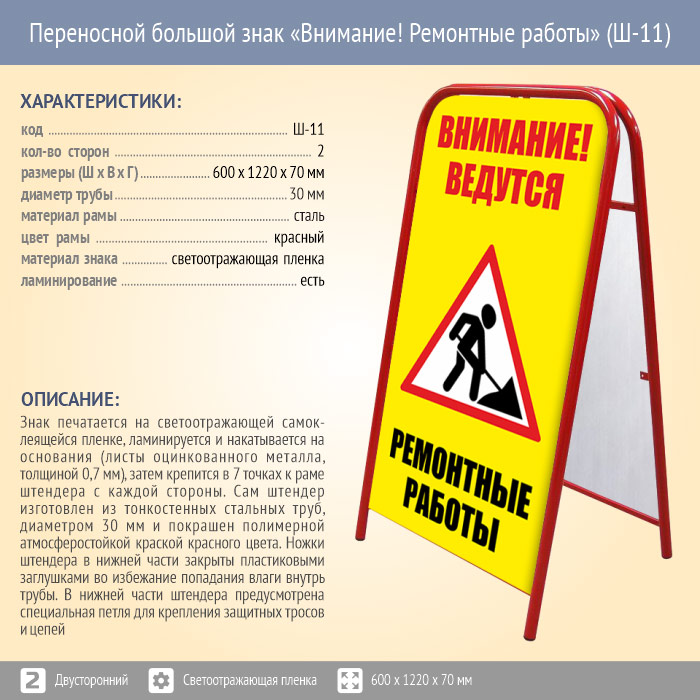 Переносной большой знак «Внимание! Ремонтные работы» (Ш-11, двусторонний, светоотражающая пленка) в Бердске купить