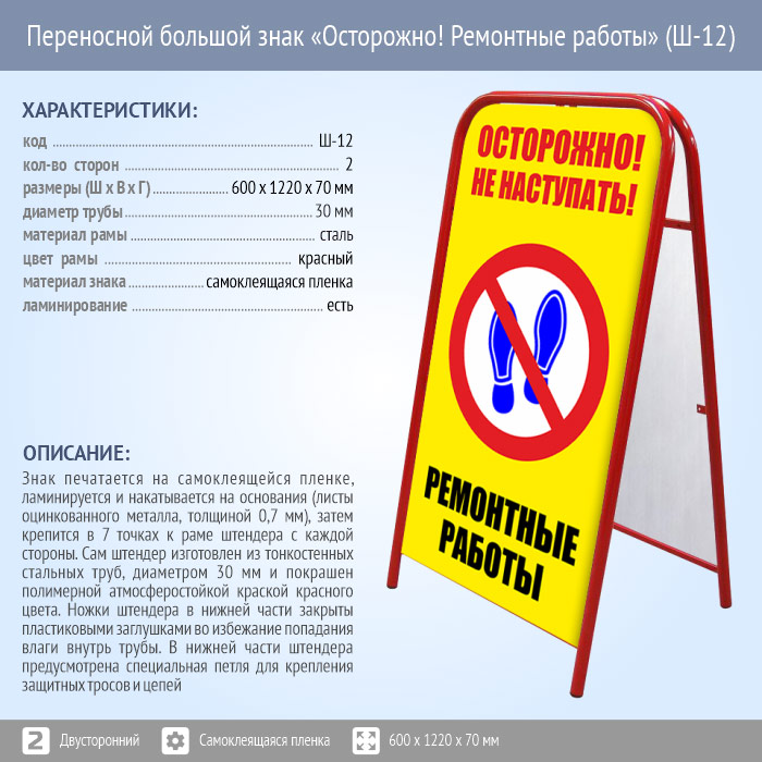 Переносной большой знак «Осторожно! Ремонтные работы» (Ш-12, двусторонний, самоклеящаяся пленка) в Бердске купить