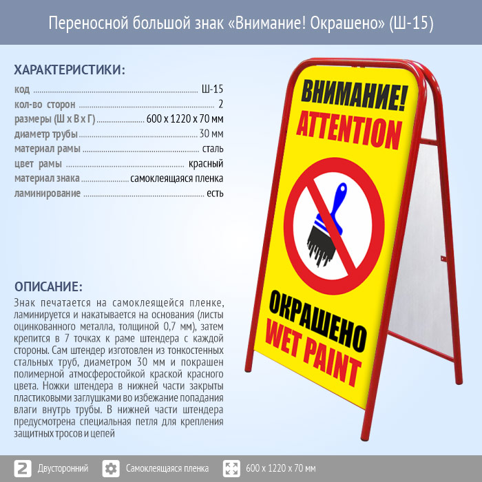 Переносной большой знак «Внимание! Окрашено» (Ш-15, двусторонний, самоклеящаяся пленка) в Бердске купить