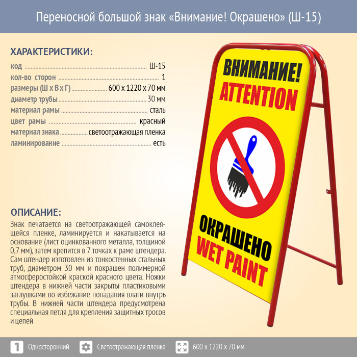 Переносной большой знак «Внимание! Окрашено» (Ш-15, односторонний, светоотражающая пленка) в Бердске купить