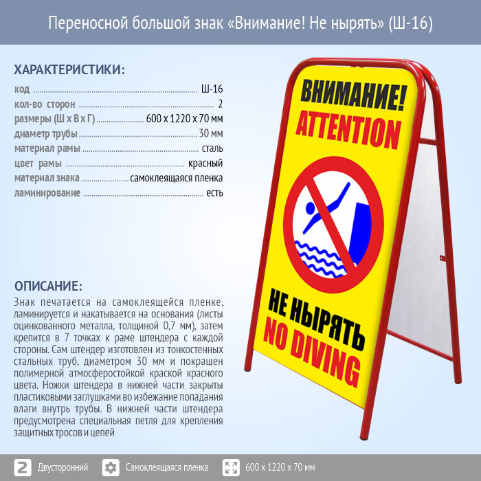 Переносной большой знак «Внимание! Не нырять» (Ш-16, двусторонний, самоклеящаяся пленка) в Бердске купить