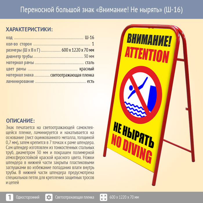Переносной большой знак «Внимание! Не нырять» (Ш-16, односторонний, светоотражающая пленка) в Бердске купить