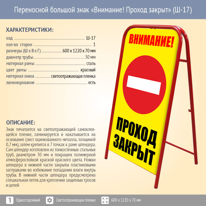 Переносной большой знак «Внимание! Проход закрыт» (Ш-17, односторонний, светоотражающая пленка) в Бердске купить