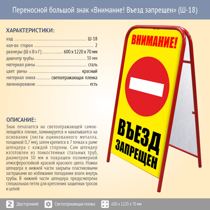 Переносной большой знак «Внимание! Въезд запрещен» (Ш-18, двусторонний, светоотражающая пленка) в Бердске купить