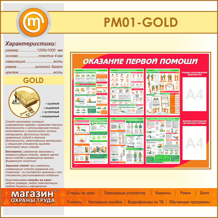 Стенд «Оказание первой помощи» с плоским и объемным карманами (PM-01-GOLD) в Бердске купить