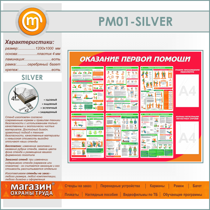 Стенд «Оказание первой помощи» с плоским и объемным карманами (PM-01-SILVER) в Бердске купить
