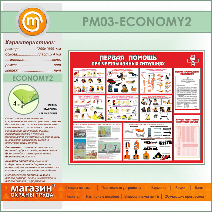 Стенд «Первая помощь при чрезвычайных ситуациях» с плоским и объемным карманами (PM-03-ECONOMY2) в Бердске купить