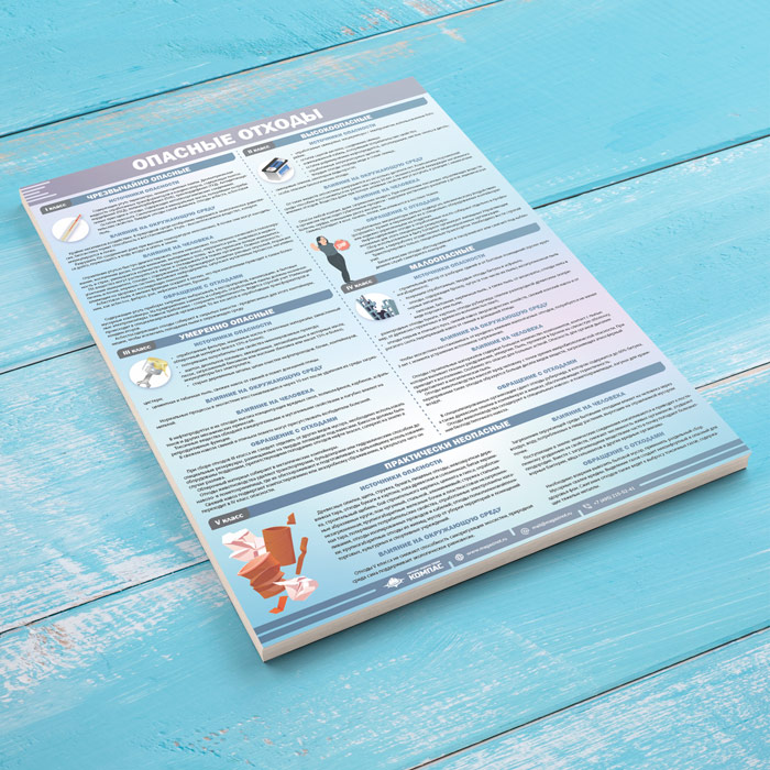 Плакат «Опасные отходы» (М-70) содержит классификацию отходов по степени воздействия на окружающую среду и человека. Рассказывает об источниках, содержащих опасные отходы и обращении с ними