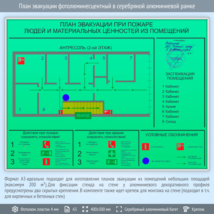 План эвакуации фотолюминесцентный в серебряной алюминиевой рамке (А3 формат) в Бердске купить