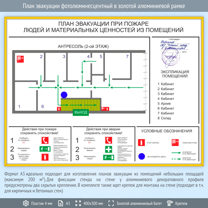План эвакуации в золотой алюминиевой рамке (А3 формат) в Бердске купить