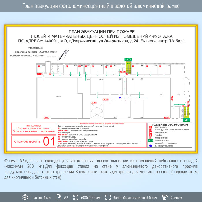 План эвакуации в золотой алюминиевой рамке (А2 формат) в Бердске купить