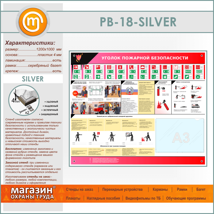 Стенд «Уголок пожарной безопасности» с карманом А3 формата (PB-18-SILVER) в Бердске купить