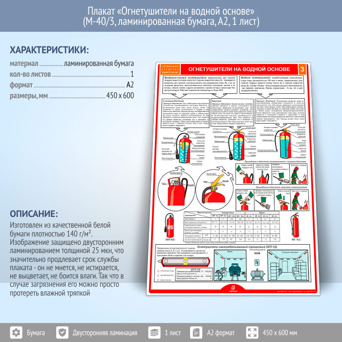 Плакат «Огнетушители на водной основе» (М-40/3, ламинированная бумага, А2, 1 лист) в Бердске купить