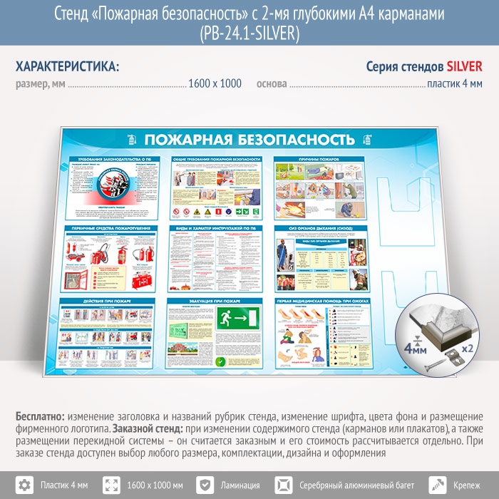 Стенд «Пожарная безопасность» с 2-мя глубокими А4 карманами (PB-24.1-SILVER) в Бердске купить