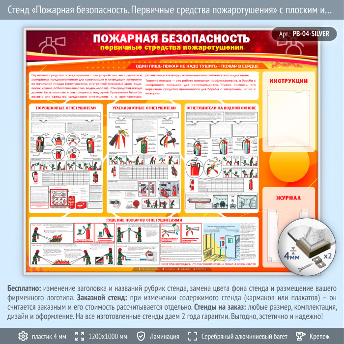 Стенд «Пожарная безопасность. Первичные средства пожаротушения» с плоским и объемным карманами (PB-04-SILVER) в Бердске купить