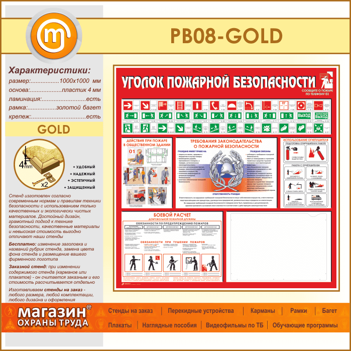 Стенд «Уголок пожарной безопасности» с карманом А3 формата (PB-08-GOLD) в Бердске купить