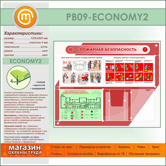 Стенд «Пожарная безопасность» с планом эвакуации, плоским и объемным карманами (PB-09-ECONOMY2) в Бердске купить