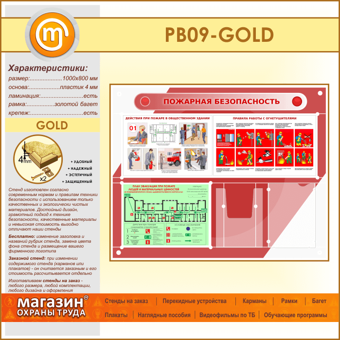 Стенд «Пожарная безопасность» с планом эвакуации, плоским и объемным карманами (PB-09-GOLD) в Бердске купить