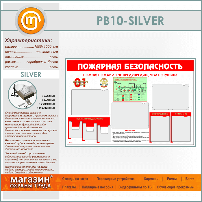 Стенд «Пожарная безопасность» с планом эвакуации, 5 плоскими и 3 объемными карманами (PB-10-SILVER) в Бердске купить