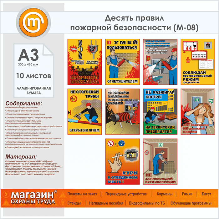 Плакаты «Десять правил пожарной безопасности» (М-08, ламинированная бумага, А3, 10 листов) в Бердске купить