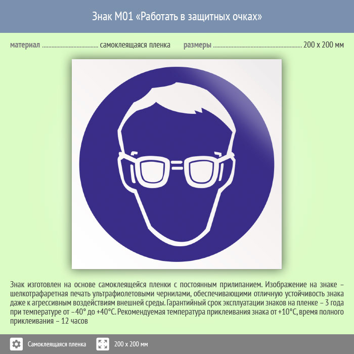 Знак M01 «Работать в защитных очках» (пленка, 200х200 мм) в Бердске купить