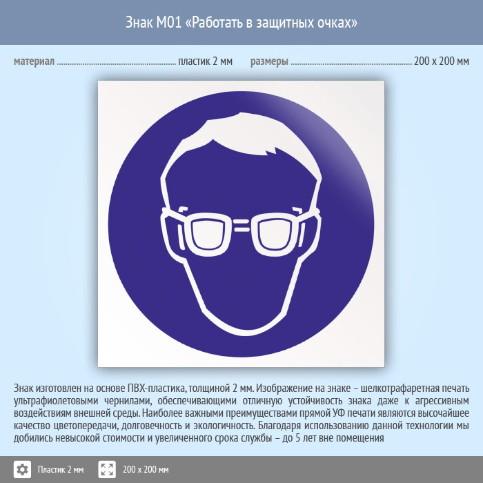 Знак M01 «Работать в защитных очках» (пластик, 200х200 мм) в Бердске купить