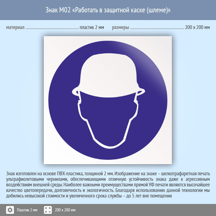 Знак M02 «Работать в защитной каске (шлеме)» (пластик, 200х200 мм) в Бердске купить