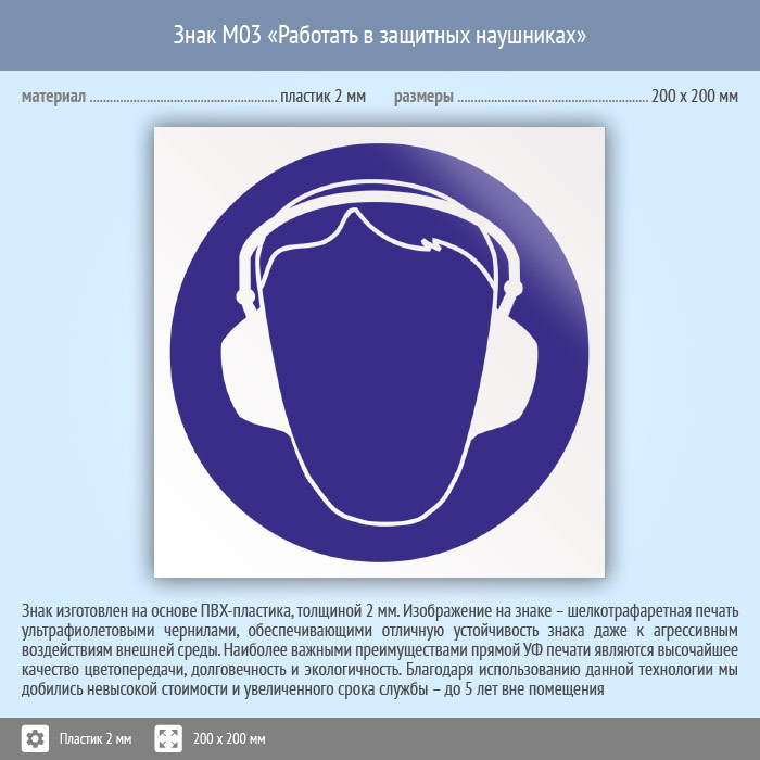 Знак M03 «Работать в защитных наушниках» (пластик, 200х200 мм) в Бердске купить