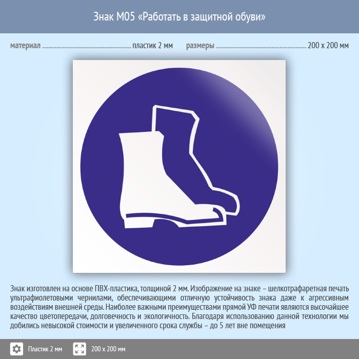 Знак M05 «Работать в защитной обуви» (пластик, 200х200 мм) в Бердске купить