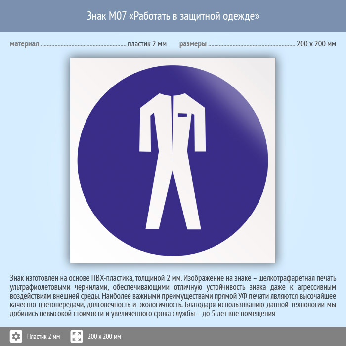 Знак M07 «Работать в защитной одежде» (пластик, 200х200 мм) в Бердске купить